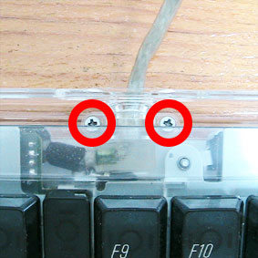 まずは、キーボード裏面のネジを4カ所外す。下の画像の赤丸内のネジだ。反対側にも同じく2カ所ある。