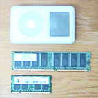 左の画像の下、小さい方が「Intel Mac mini 用のメモリ」で、上の大きい方が「PPC(G4)Mac mini 用のメモリ」です。
